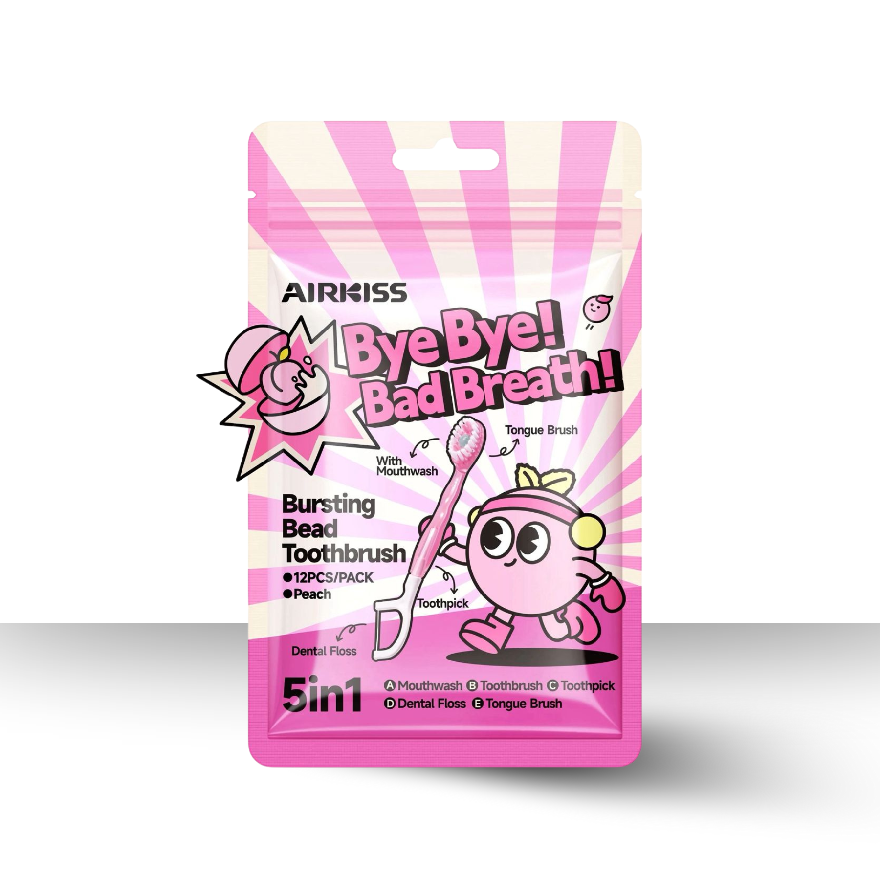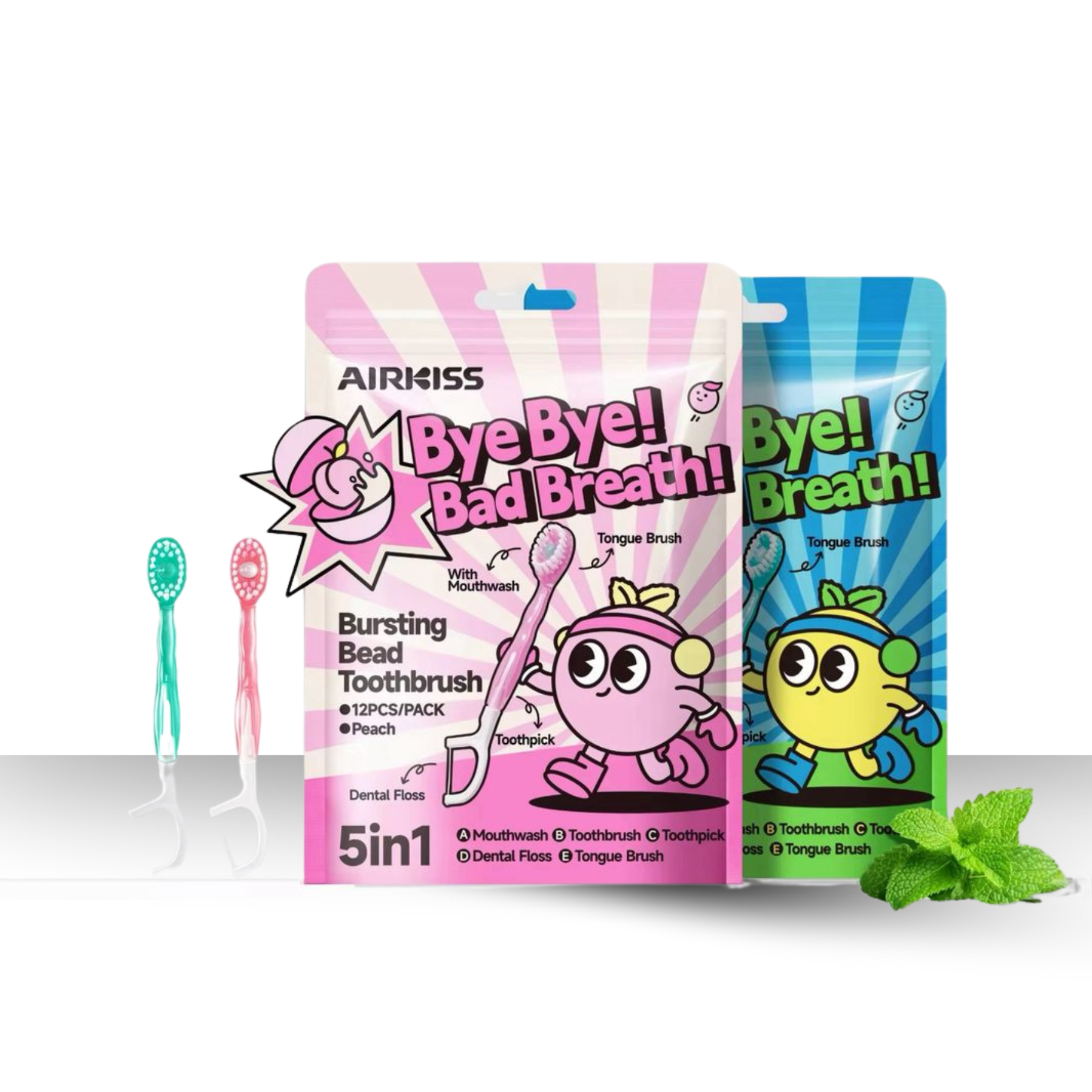 - 🍑 Peach Flex: Fruity-fresh toothbrush kit with a built-in tongue scraper, toothpaste, and toothpick